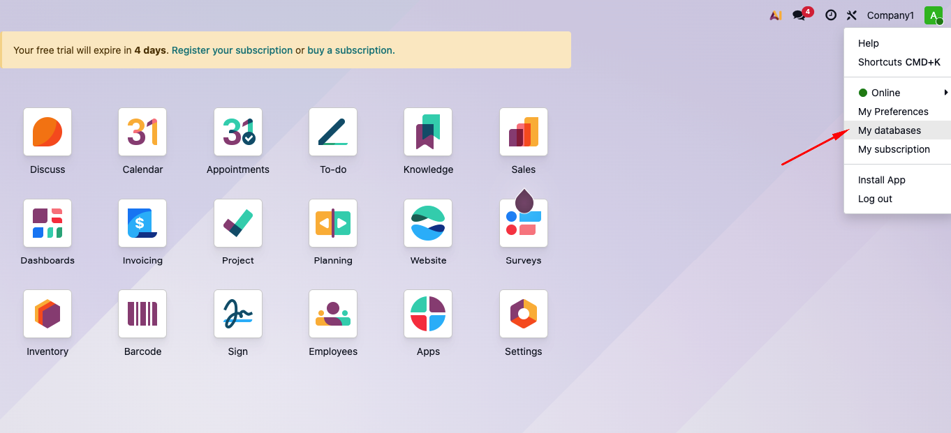 First, log in to your Odoo account associated with the database you want to duplicate.