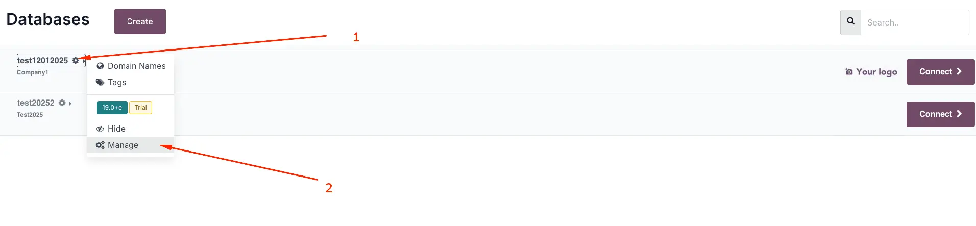 After logging in, navigate to the list of available databases. This is where Odoo allows you to manage your databases, including duplicating them for testing purposes.