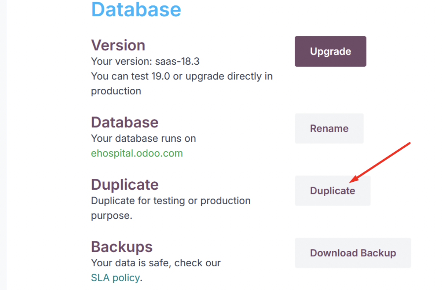 To avoid these risks, Odoo Online provides an official way to create a test environment by duplicating the existing database. This allows all testing, analysis, and configuration work to be done safely, without impacting the live system.