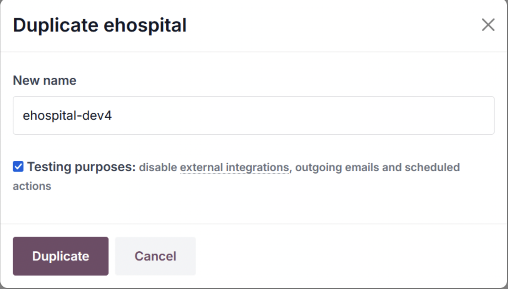 After clicking Duplicate, a new window will appear. In this window, enter the name of the test database (for example, adding -test or -staging to the original name).