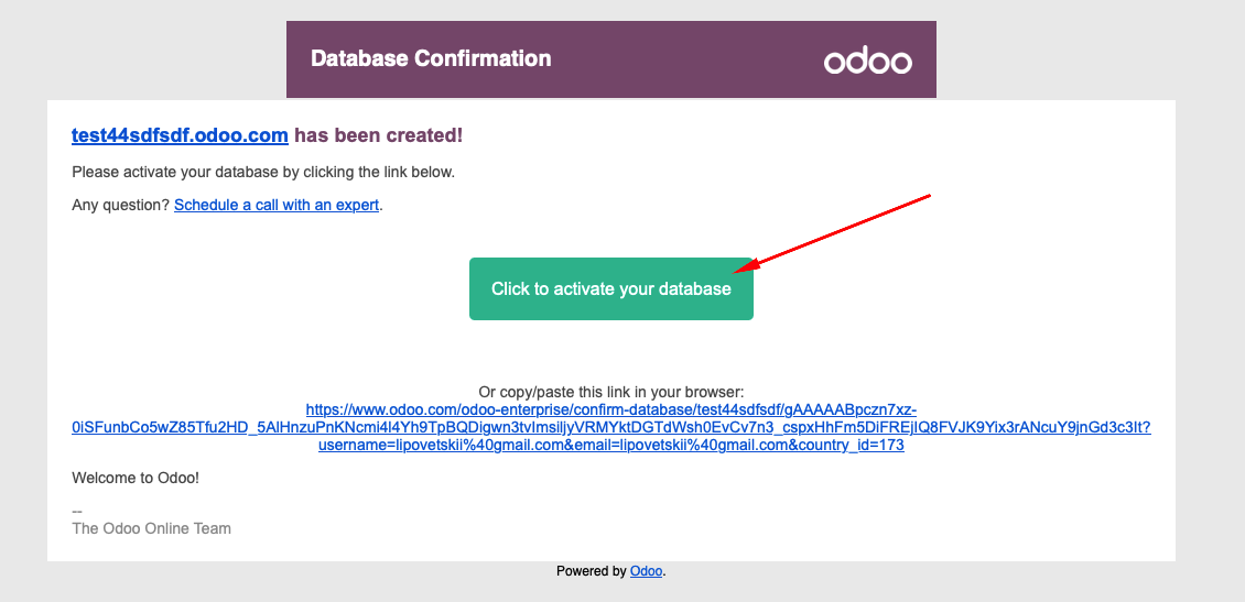 After sending the confirmation request, open your email inbox and locate the message from Odoo.