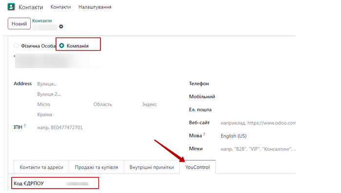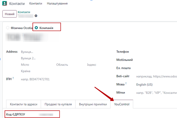 2. Заповнити поле “Код ЄДРПОУ” у вкладці “Youcontrol”